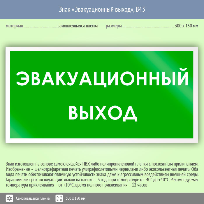 Знак «Эвакуационный выход», B43 (пленка, 300х150 мм) в Нижнекамске купить