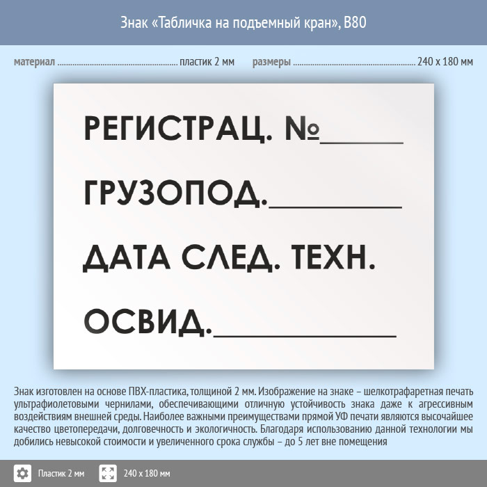 Знак «Табличка на подъемный кран», B80 (пластик, 240х180 мм) в Нижнекамске купить