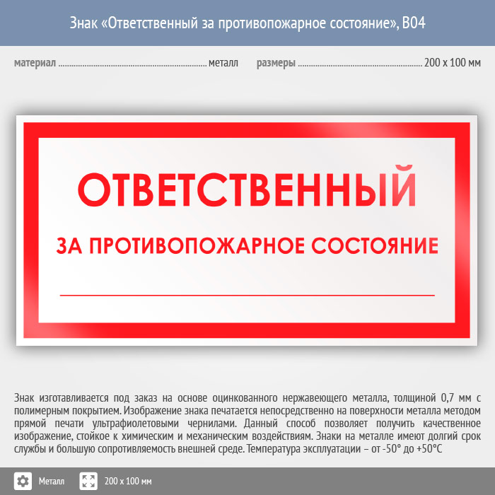 Знак «Ответственный за противопожарное состояние», B04 (металл, 200х100 мм) в Нижнекамске купить