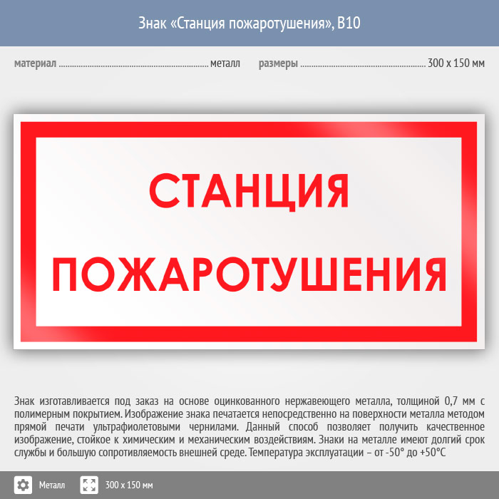 Знак «Станция пожаротушения», B10 (металл, 300х150 мм) в Нижнекамске купить