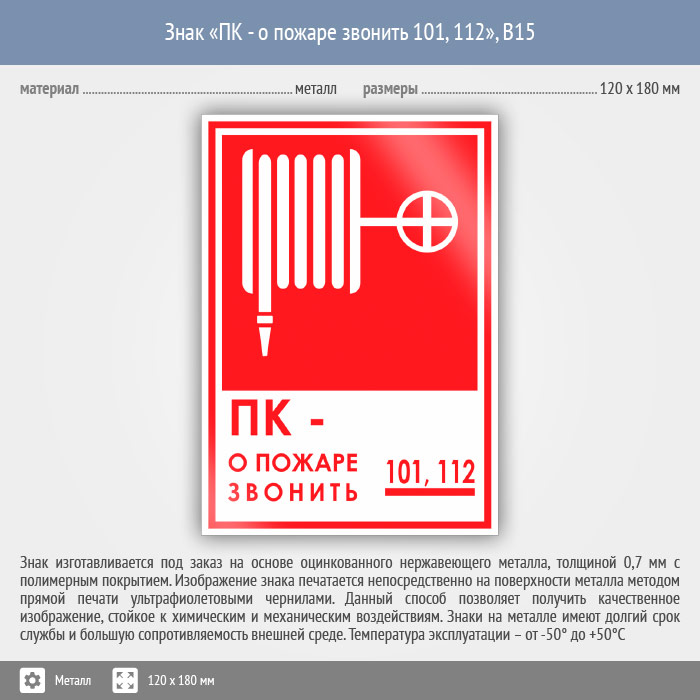 Знак «ПК - о пожаре звонить 101, 112», B15 (металл, 120х180 мм) в Нижнекамске купить