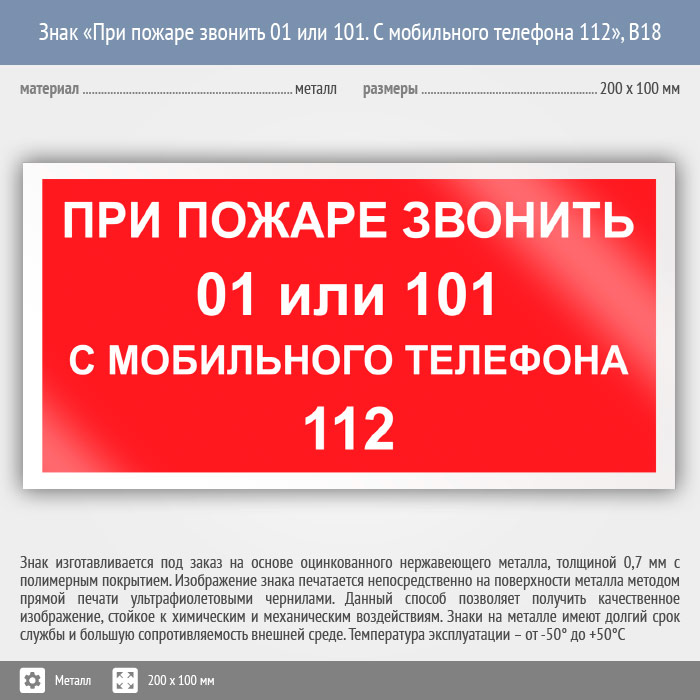 Знак «При пожаре звонить 01 или 101. С мобильного телефона 112», B18 (металл, 200х100 мм) в Нижнекамске купить