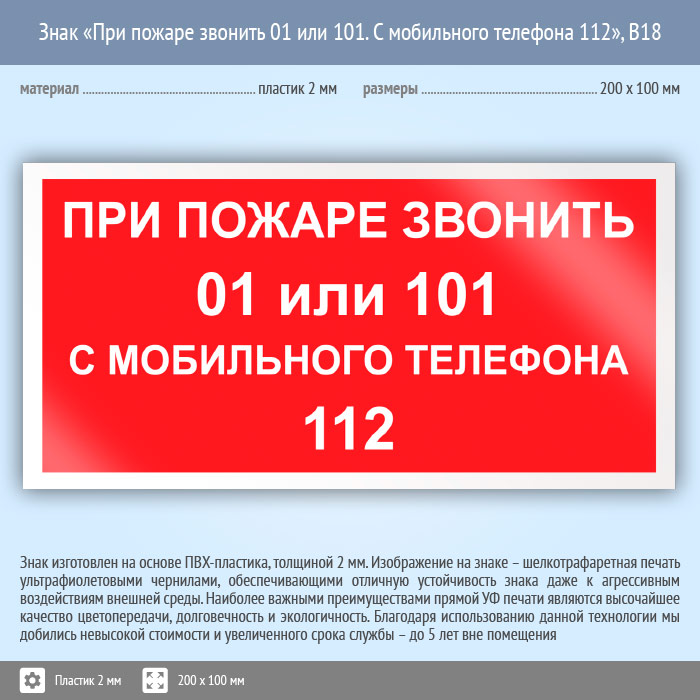 Знак «При пожаре звонить 01 или 101. С мобильного телефона 112», B18 (пластик, 200х100 мм) в Нижнекамске купить