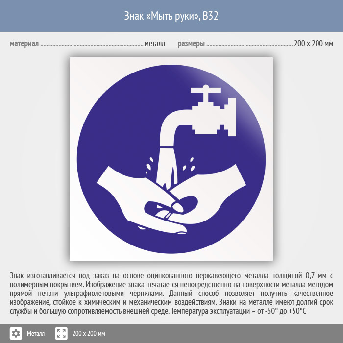 Знак «Мыть руки», B32 (металл, 200х200 мм) в Нижнекамске купить