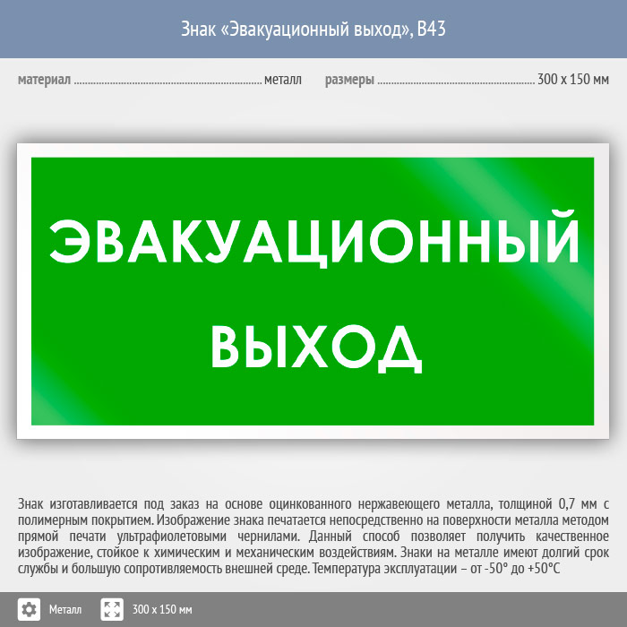 Знак «Эвакуационный выход», B43 (металл, 300х150 мм) в Нижнекамске купить