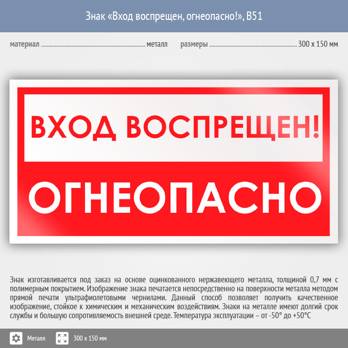 Знак «Вход воспрещен, огнеопасно!», B51 (металл, 300х150 мм) в Нижнекамске купить