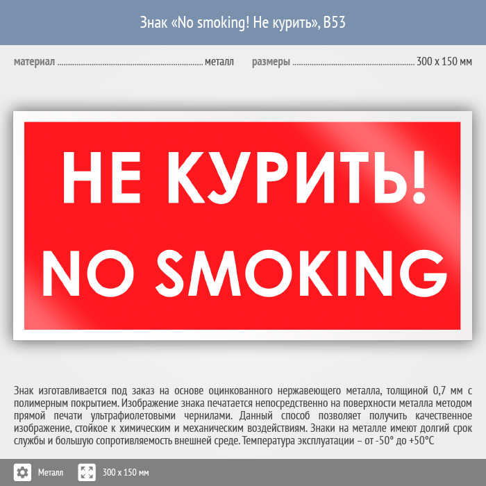 Знак «No smoking! Не курить», B53 (металл, 300х150 мм) в Нижнекамске купить