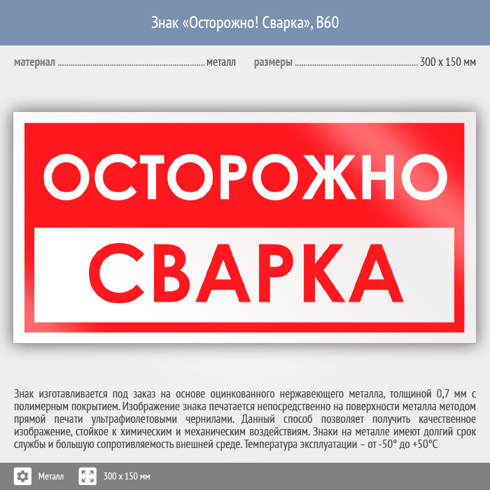 Знак «Осторожно! Сварка», B60 (металл, 300х150 мм) в Нижнекамске купить