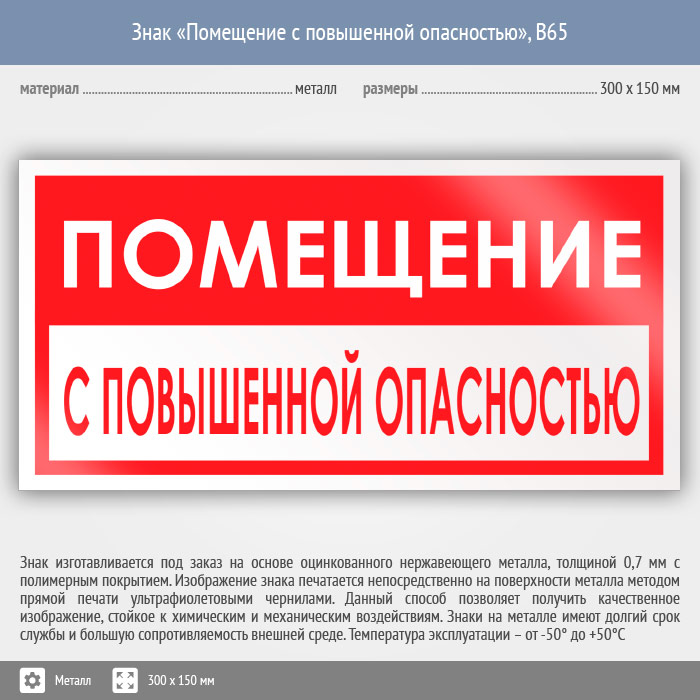 Знак «Помещение с повышенной опасностью», B65 (металл, 300х150 мм) в Нижнекамске купить