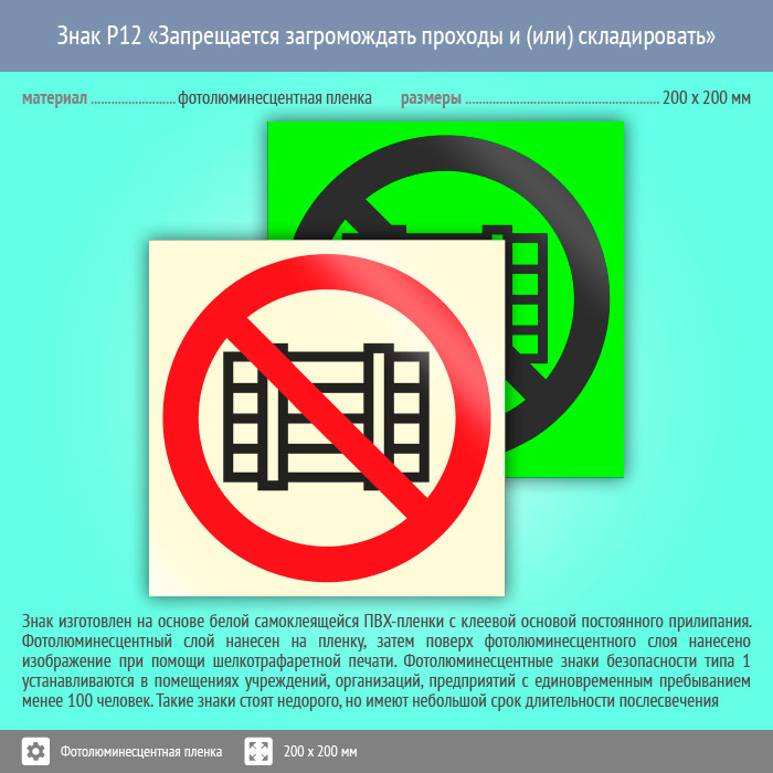 Знак P12 «Запрещается загромождать проходы и (или) складировать» (фотолюминесцентная пленка, 200х200 мм) в Нижнекамске купить