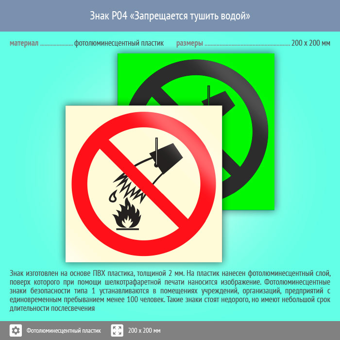 Знак P04 «Запрещается тушить водой» (фотолюминесцентный пластик, 200х200 мм) в Нижнекамске купить