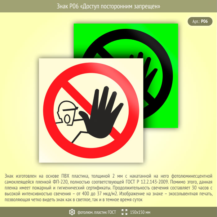 Знак P06 «Доступ посторонним запрещен» (фотолюминесцентный пластик ГОСТ 34428-2018, 150х150 мм) в Нижнекамске купить