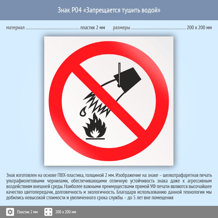 Знак P04 «Запрещается тушить водой» (пластик, 200х200 мм) в Нижнекамске купить