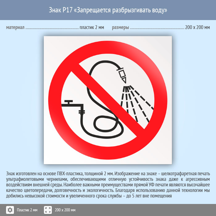Знак P17 «Запрещается разбрызгивать воду» (пластик, 200х200 мм) в Нижнекамске купить