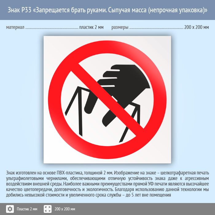 Знак P33 «Запрещается брать руками. Сыпучая масса (непрочная упаковка)» (пластик, 200х200 мм) в Нижнекамске купить