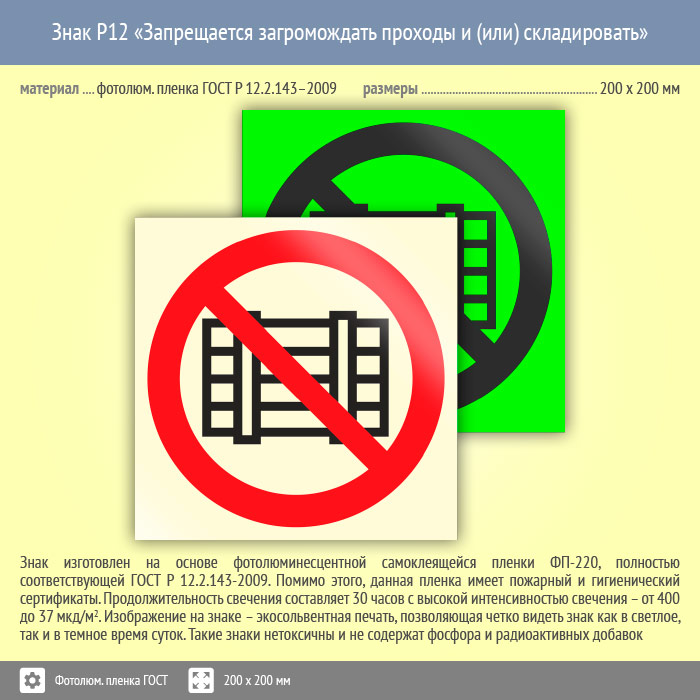 Знак P12 «Запрещается загромождать проходы и (или) складировать» (фотолюминесцентная пленка ГОСТ 34428-2018, 200х200 мм) в Нижнекамске купить