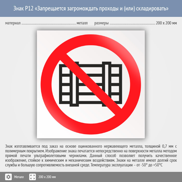 Знак P12 «Запрещается загромождать проходы и (или) складировать» (металл, 200х200 мм) в Нижнекамске купить