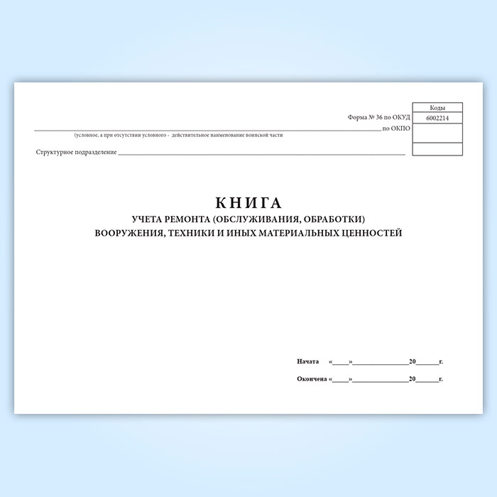 Книга учета ремонта (обслуживания, обработки) вооружения, техники и иных материальных ценностей (форма 36) в Нижнекамске купить