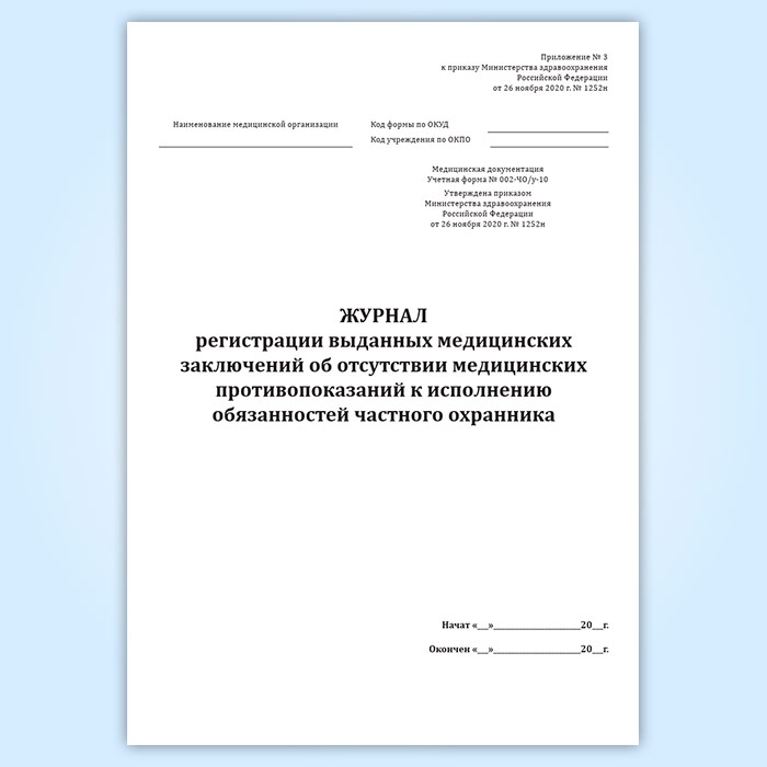 Журнал регистрации выданных медицинских заключений об отсутствии медицинских противопоказаний к исполнению обязанностей частного охранника (учетная форма № 002-ЧО/у-10) в Нижнекамске купить