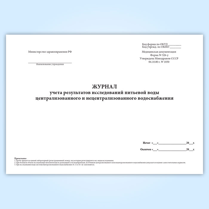 Журнал учета результатов исследований питьевой воды централизованного и нецентрализованного водоснабжения (форма 326-у) в Нижнекамске купить