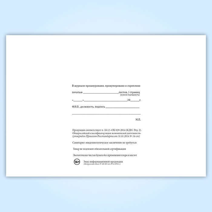 Вы получаете печатную продукцию прошнурованной и c местом для вашей печати в соответствии с действующими нормативными документами: