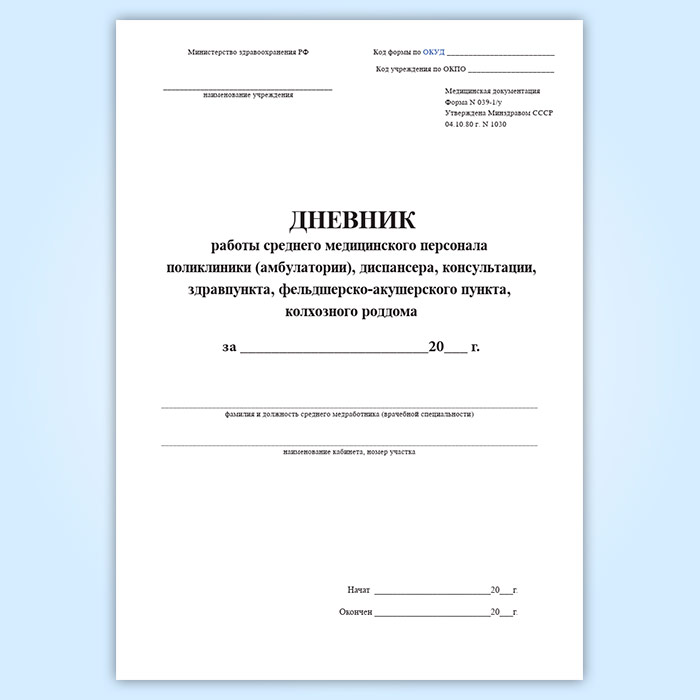 Дневник работы среднего медицинского персонала поликлиники (амбулатории), диспансера, консультации, здравпункта, фельдшерско-акушерского пункта, колхозного роддома (форма 039-1/у) в Нижнекамске купить