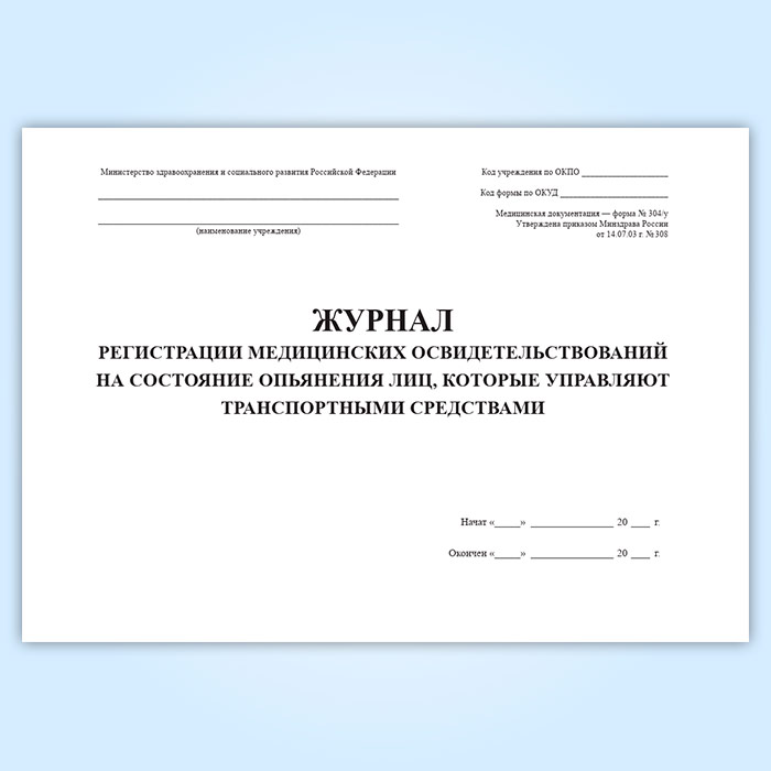 Журнал регистрации медицинских освидетельствований на состояние опьянения лиц, которые управляют транспортными средствами (форма 304/у) в Нижнекамске купить