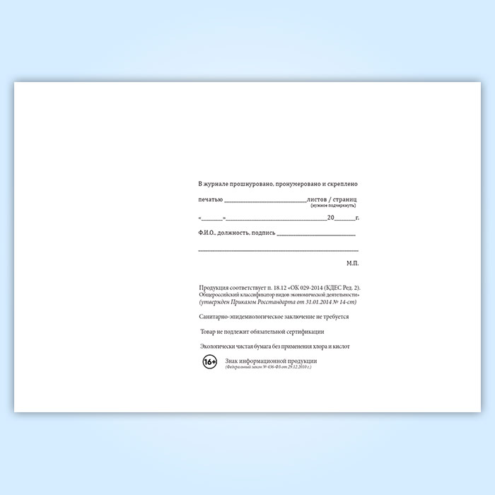 Вы получаете печатную продукцию прошнурованной и c местом для вашей печати в соответствии с действующими нормативными документами: