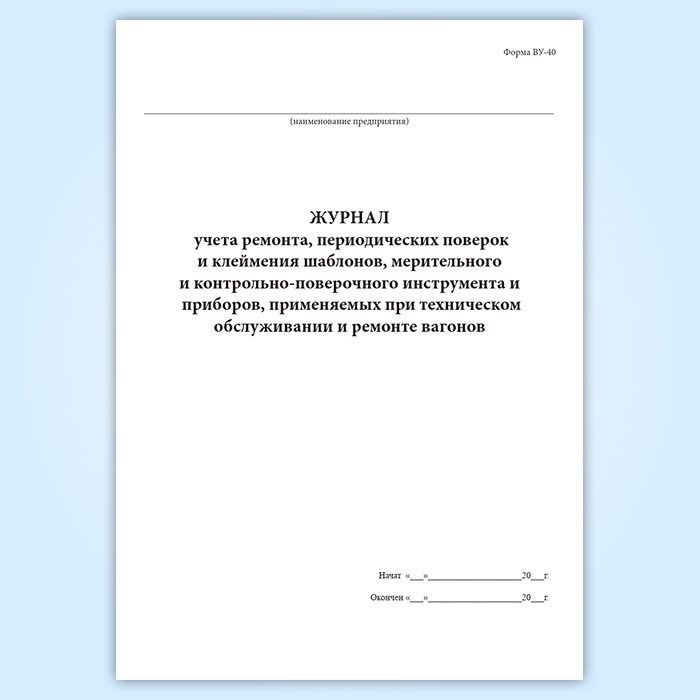 Журнал учета ремонта, периодических поверок и клеймения шаблонов, мерительного и контрольно-поверочного инструмента и приборов, применяемых при техническом обслуживании и ремонте вагонов (форма ВУ-40) в Нижнекамске купить