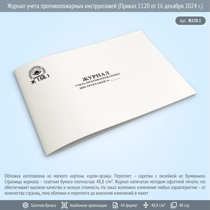 Журнал учета противопожарных инструктажей (Приказ 1120 от 16 декабря 2024 г.) (48 стр., Ж158.1) в Нижнекамске купить