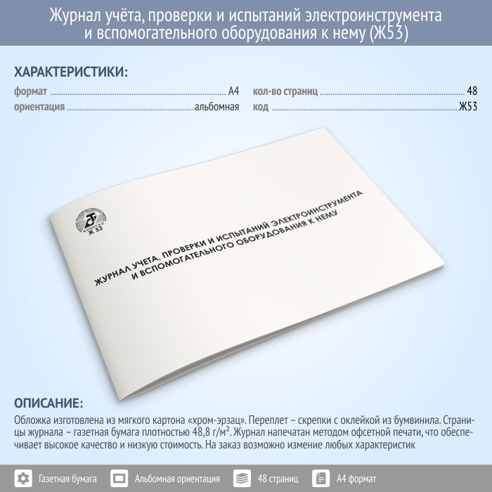 Журнал учета, проверки и испытаний электроинструмента и вспомогательного оборудования к нему (48 стр., Ж53) в Нижнекамске купить