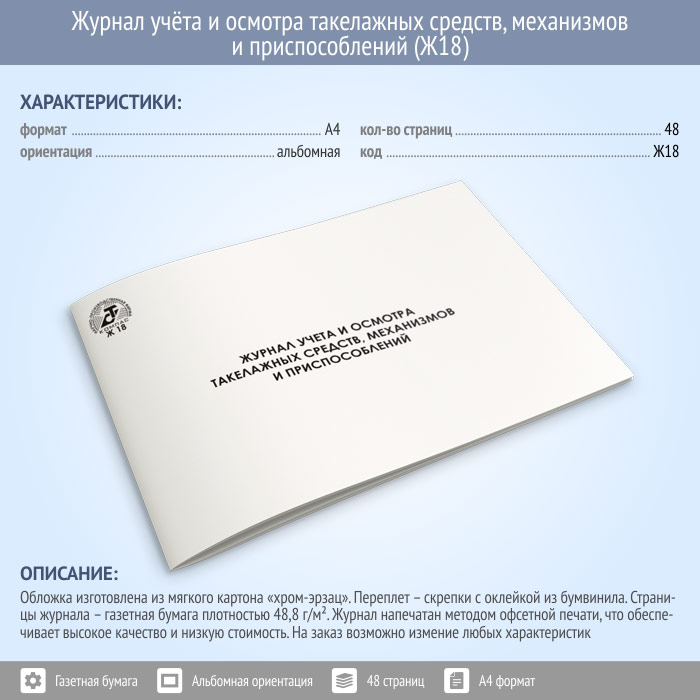 Журнал учета и осмотра такелажных средств, механизмов и приспособлений (48 стр., Ж18) в Нижнекамске купить