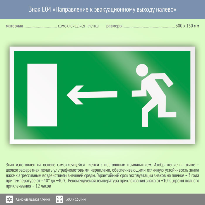 Знак «Направление к эвакуационному выходу налево» может быть изготовлен любого размера на самоклеящейся пленке, пластике толщиной 0.5, 2 или 4 мм и металле. Также возможно применение фотолюминесцентных и световозвращающих материалов