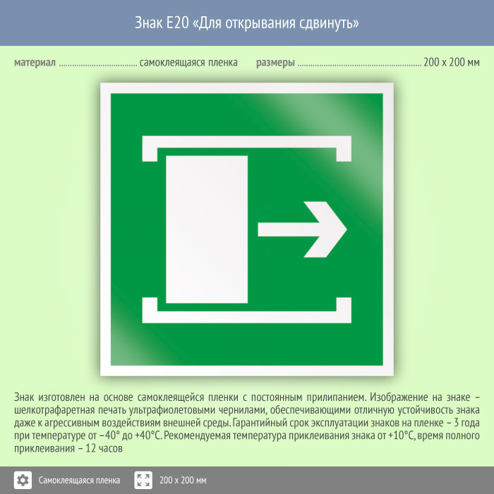 Знак «Для открывания сдвинуть» может быть изготовлен любого размера на самоклеящейся пленке, пластике толщиной 0.5, 2 или 4 мм и металле. Также возможно применение фотолюминесцентных и световозвращающих материалов