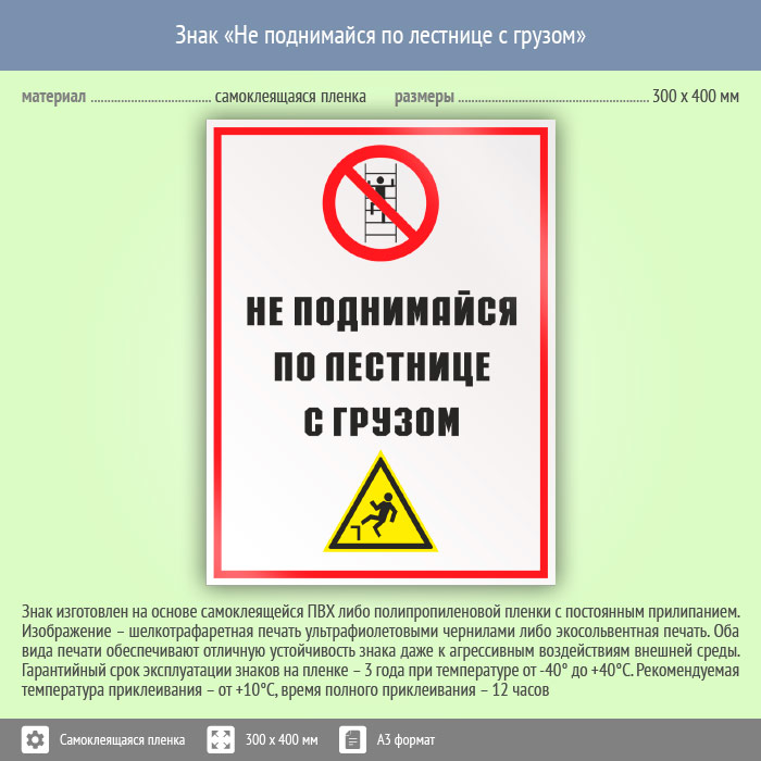 Знак «Не поднимайся по лестнице с грузом» может быть изготовлен любого размера на самоклеящейся пленке, пластике толщиной 0.5, 2 или 4 мм и металле. Также возможно применение фотолюминесцентных и световозвращающих материалов