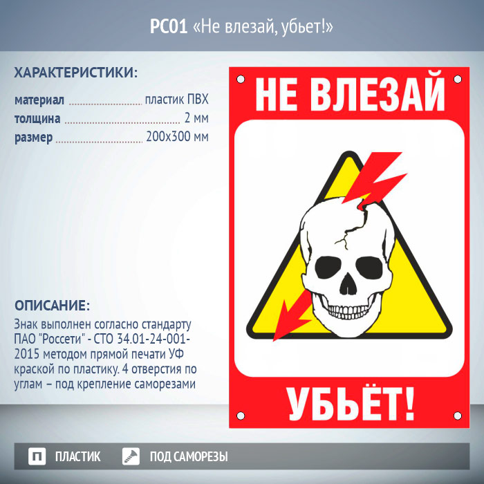 Знаки безопасности «Не влезай, убьет!» выполнены согласно стандарта ПАО «Россети» – СТО 34.01-24-001-2015 методом прямой печати УФ краской по ПВХ-пластику (толщиной 2 мм) либо оцинкованному металлу (толщиной 0,8 мм с полимерным покрытием). Размеры знаков – 200×300 мм. Для крепления знаков предусмотрены 4 отверстия по углам – под крепление саморезами на деревянную опору и в моделях с отверстиями под бандажную ленту – 8 отверстий для крепления на бетонную и металлическую опоры. Также есть версии без отверстий