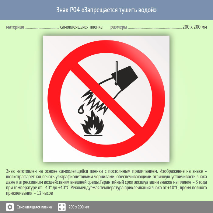 Знак «Запрещается тушить водой» может быть изготовлен любого размера на самоклеящейся пленке, пластике толщиной 0.5, 2 или 4 мм и металле. Также возможно применение фотолюминесцентных и световозвращающих материалов