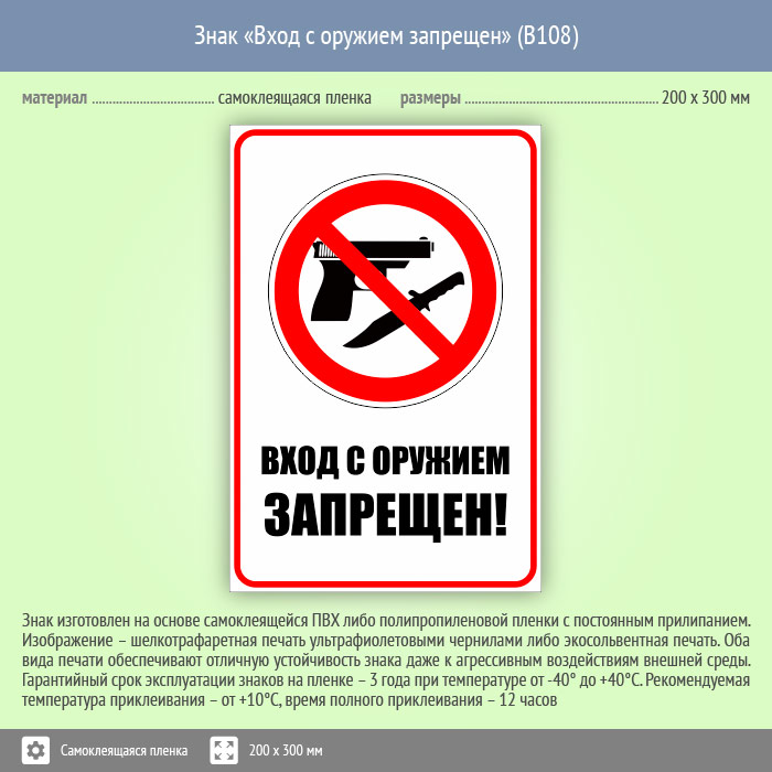 Знак (табличка) «Вход с оружием запрещен» имеет размер(ы): 200х300 мм, 300х400 мм, но может быть изготовлен(а) любого размера на самоклеящейся пленке, пластике толщиной 0.5, 2 или 4 мм и металле. Также возможно применение фотолюминесцентных и световозвращающих материалов
