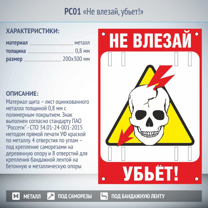 Знак «Не влезай, убьет!», РС01 (металл, 200х300 мм, отверстия под бандажную ленту) в Нижнекамске купить