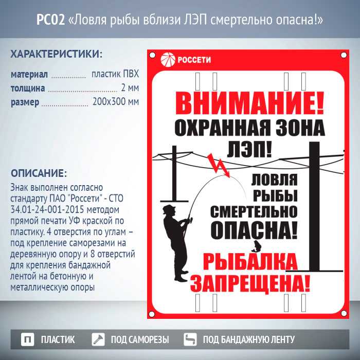 Знак «Ловля рыбы вблизи ЛЭП смертельно опасна!», РС02 (пластик 2 мм, 200х300 мм, отверстия под бандажную ленту) в Нижнекамске купить