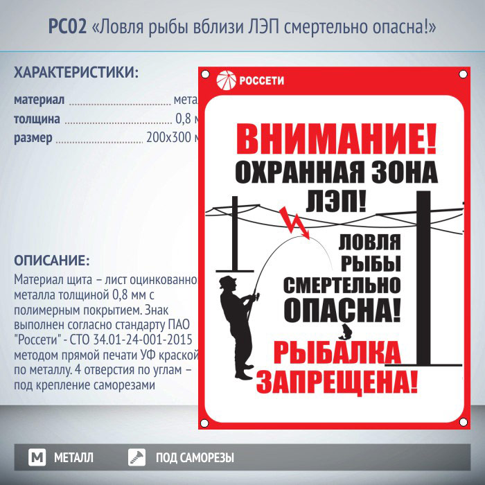 Знак «Ловля рыбы вблизи ЛЭП смертельно опасна!», РС02 (металл, 200х300 мм, отверстия под саморезы) в Нижнекамске купить