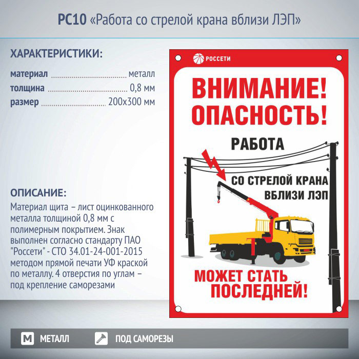 Знак «Работа со стрелой крана вблизи ЛЭП», РС10 (металл, 200х300 мм, отверстия под саморезы) в Нижнекамске купить