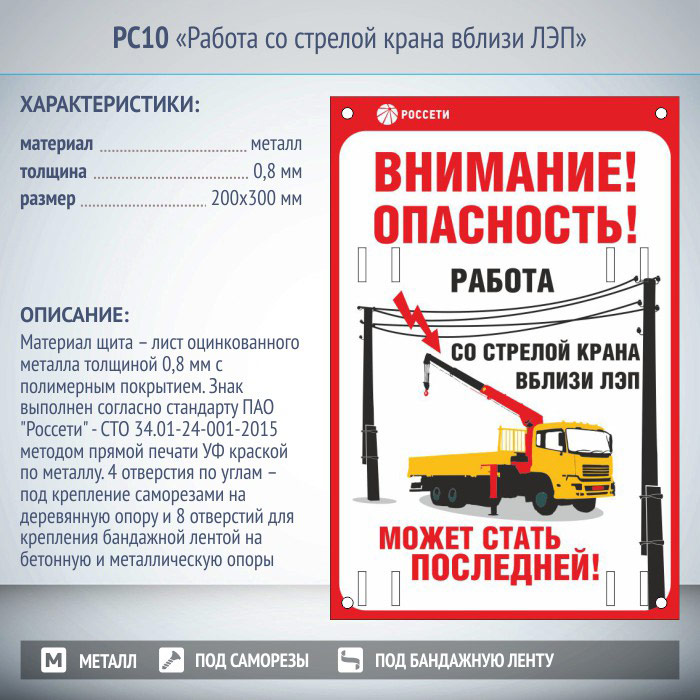 Знак «Работа со стрелой крана вблизи ЛЭП», РС10 (металл, 200х300 мм, отверстия под бандажную ленту) в Нижнекамске купить
