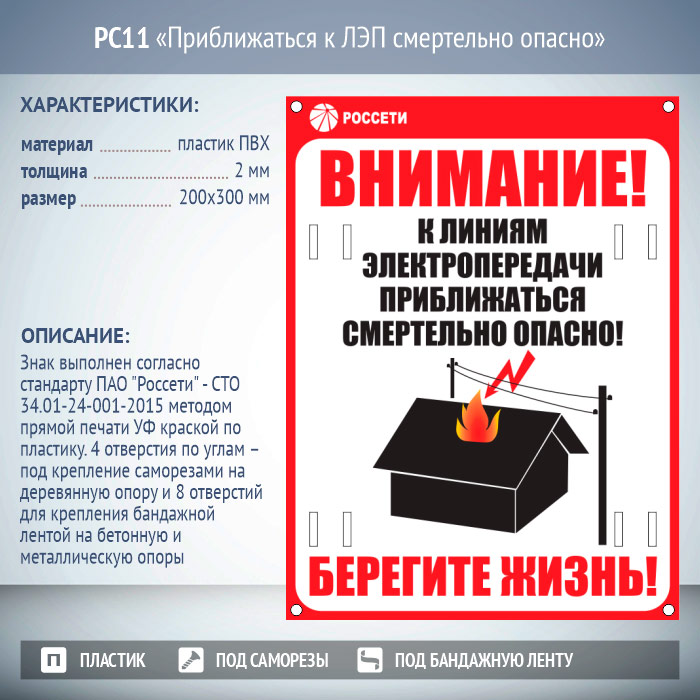 Знак «Приближаться к ЛЭП смертельно опасно», РС11 (пластик 2 мм, 200х300 мм, отверстия под бандажную ленту) в Нижнекамске купить
