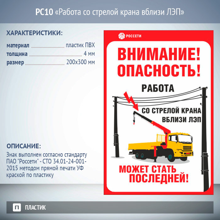 Знак «Работа со стрелой крана вблизи ЛЭП», РС10 (пластик 2 мм, 200х300 мм) в Нижнекамске купить