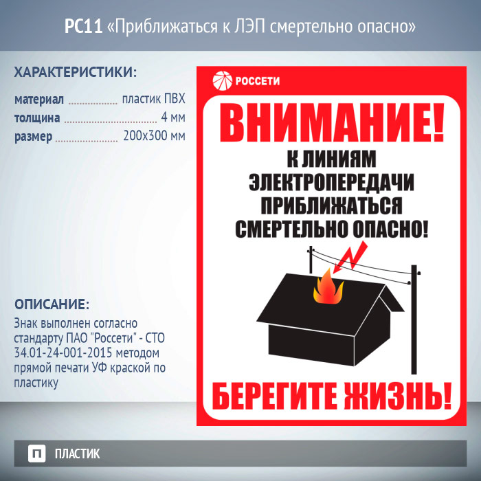 Знак «Приближаться к ЛЭП смертельно опасно», РС11 (пластик 2 мм, 200х300 мм) в Нижнекамске купить