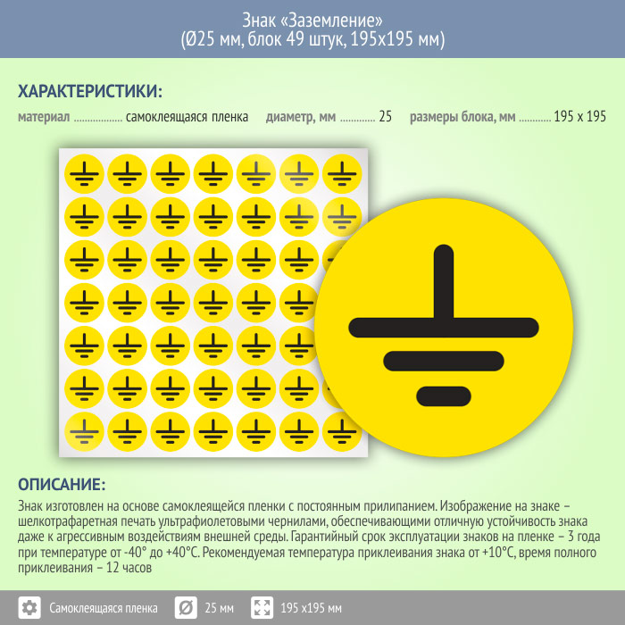 Знак (плакат) «Заземление», S46 (пленка, диаметр 25 мм, блок 49 штук, 195х195 мм) в Нижнекамске купить