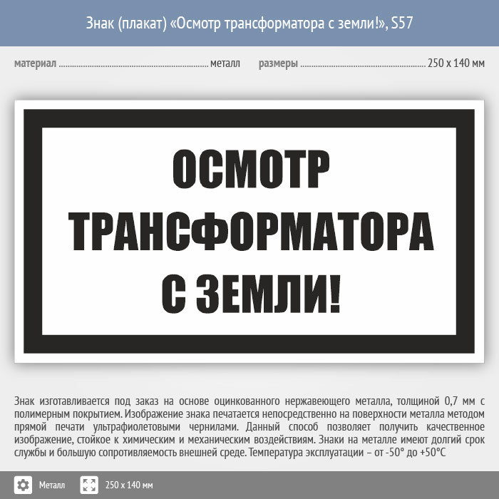 Знак (плакат) «Осмотр трансформатора с земли!», S57 (металл, 250х140 мм) в Нижнекамске купить
