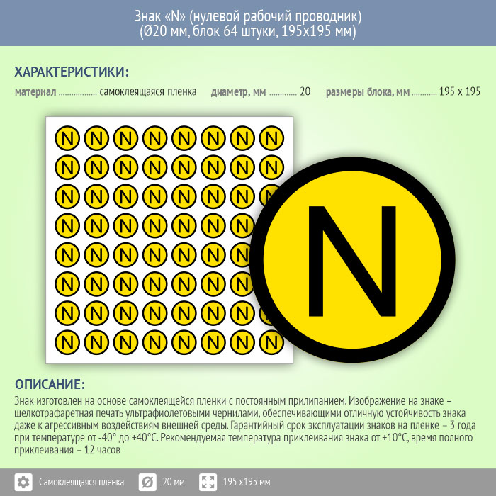 Знак (плакат) «N» (нулевой рабочий проводник), S47 (пленка, диаметр 20 мм, блок 64 штуки, 195х195 мм) в Нижнекамске купить