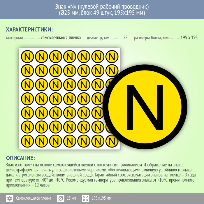 Знак (плакат) «N» (нулевой рабочий проводник), S47 (пленка, диаметр 25 мм, блок 49 штук, 195х195 мм) в Нижнекамске купить